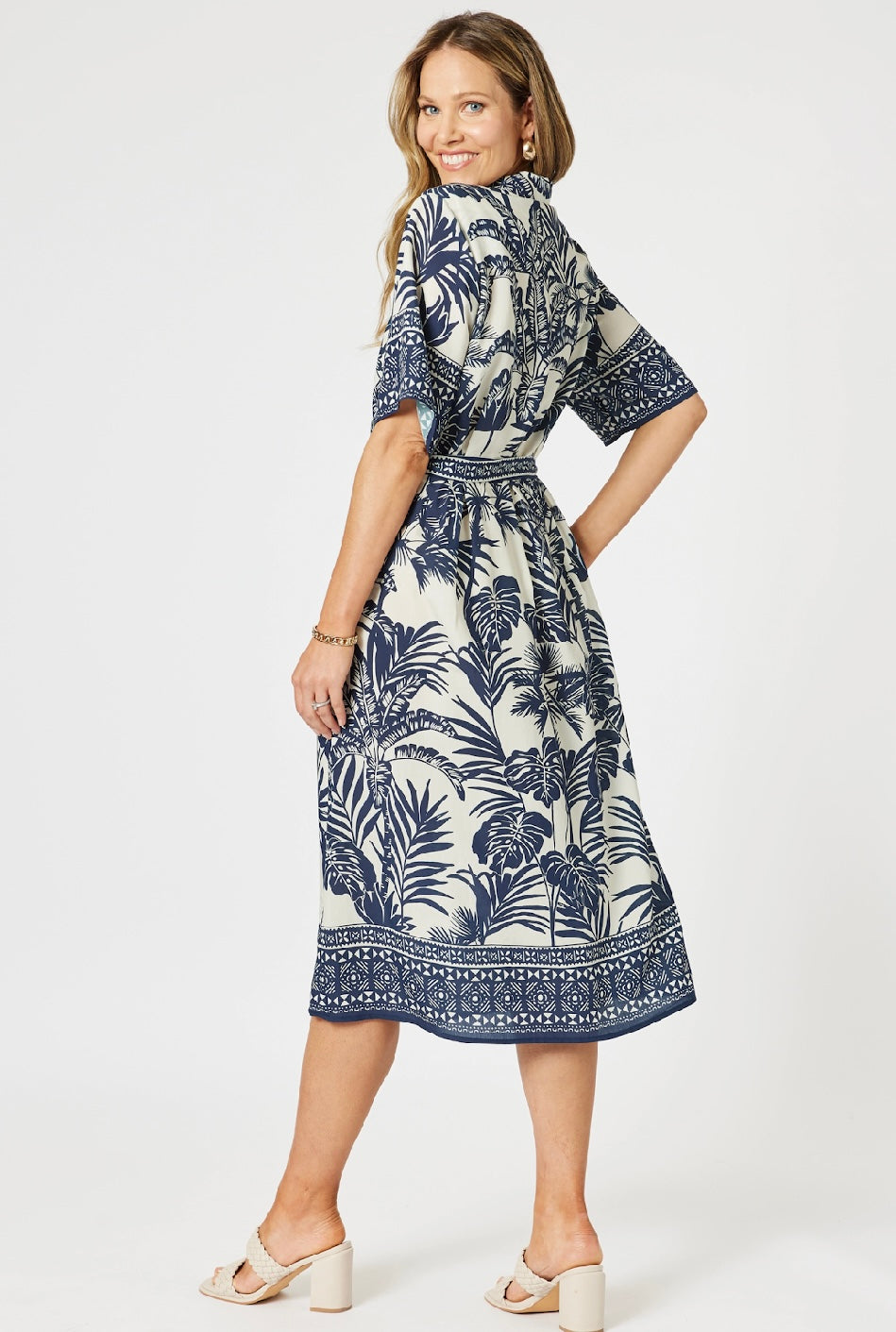 Gordon Smith navy and cream boarder printed dress with collar and belt